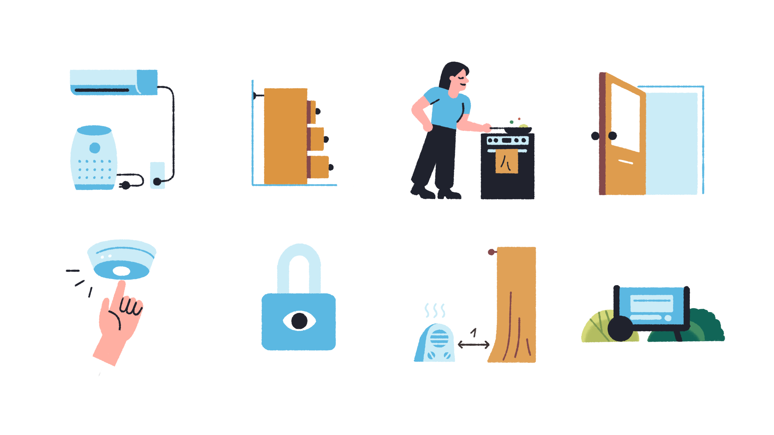 A house section and a set of spot illustrations highlighting safety do and don’ts at home.